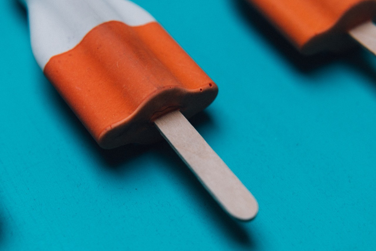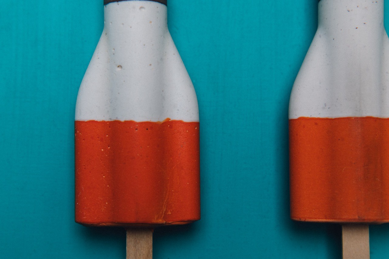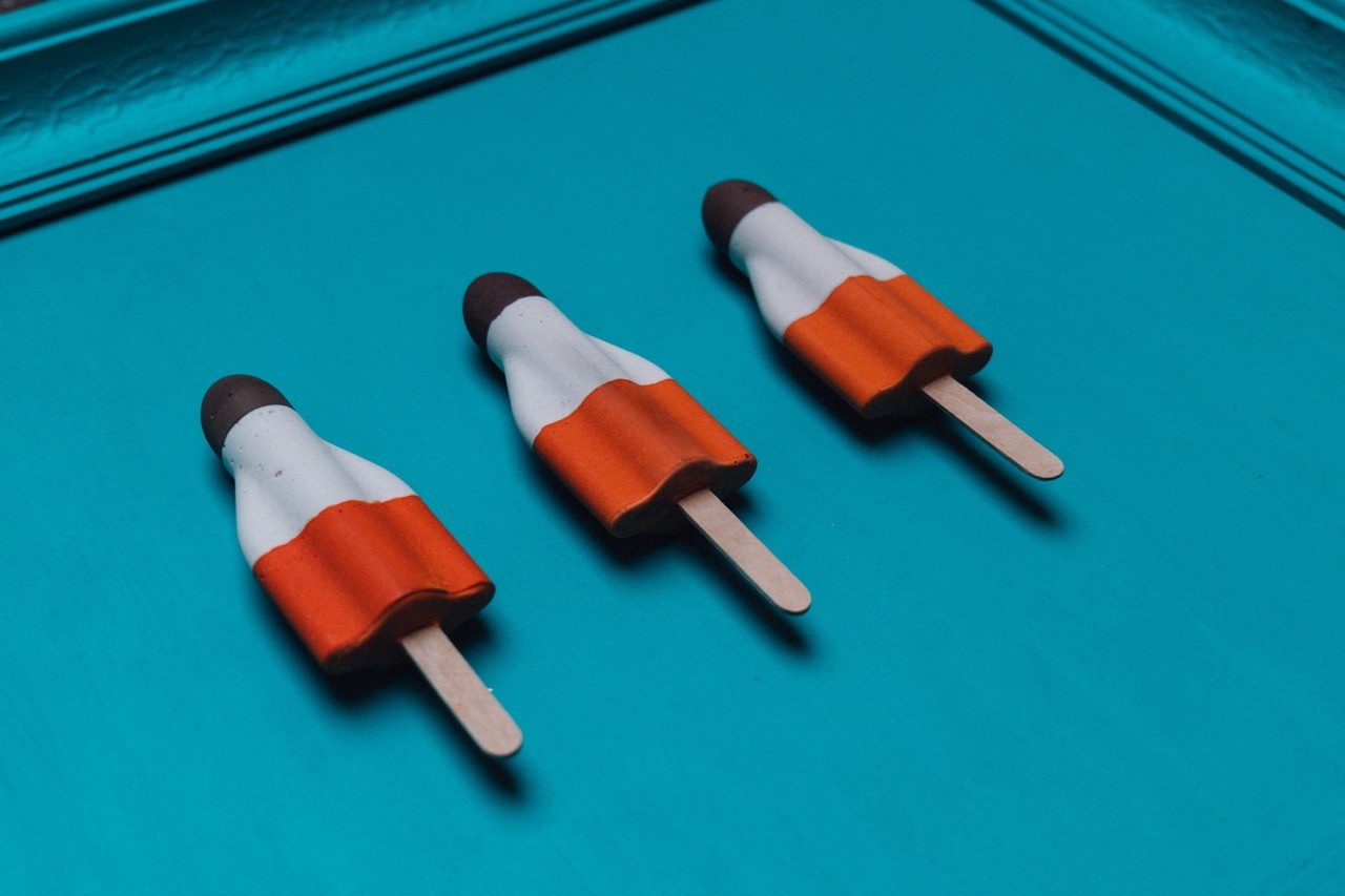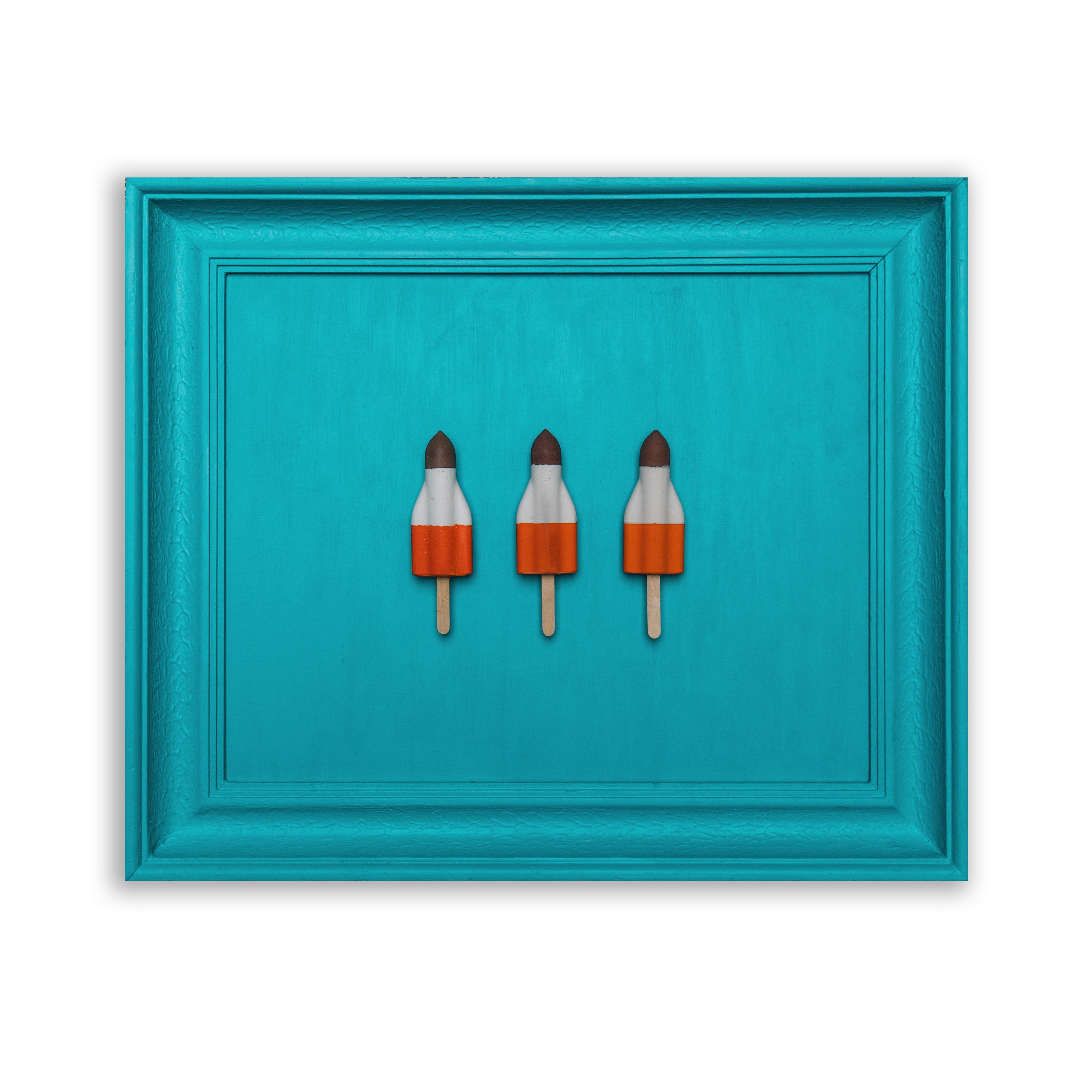 Drei handgegossene Raketenglacés sind symmetrisch auf türkisfarbenem Hintergrund arrangiert. Die Nachbildungen in Acrylharz zeigen durch feine Oberflächenstrukturen die Individualität jedes Gusses, während sie die ikonische Form des Schweizer Kulturguts bewahren. Die Transformation des vergänglichen Eiskreams in dauerhafte Objekte lädt zur Reflexion über Erinnerung und Beständigkeit ein.